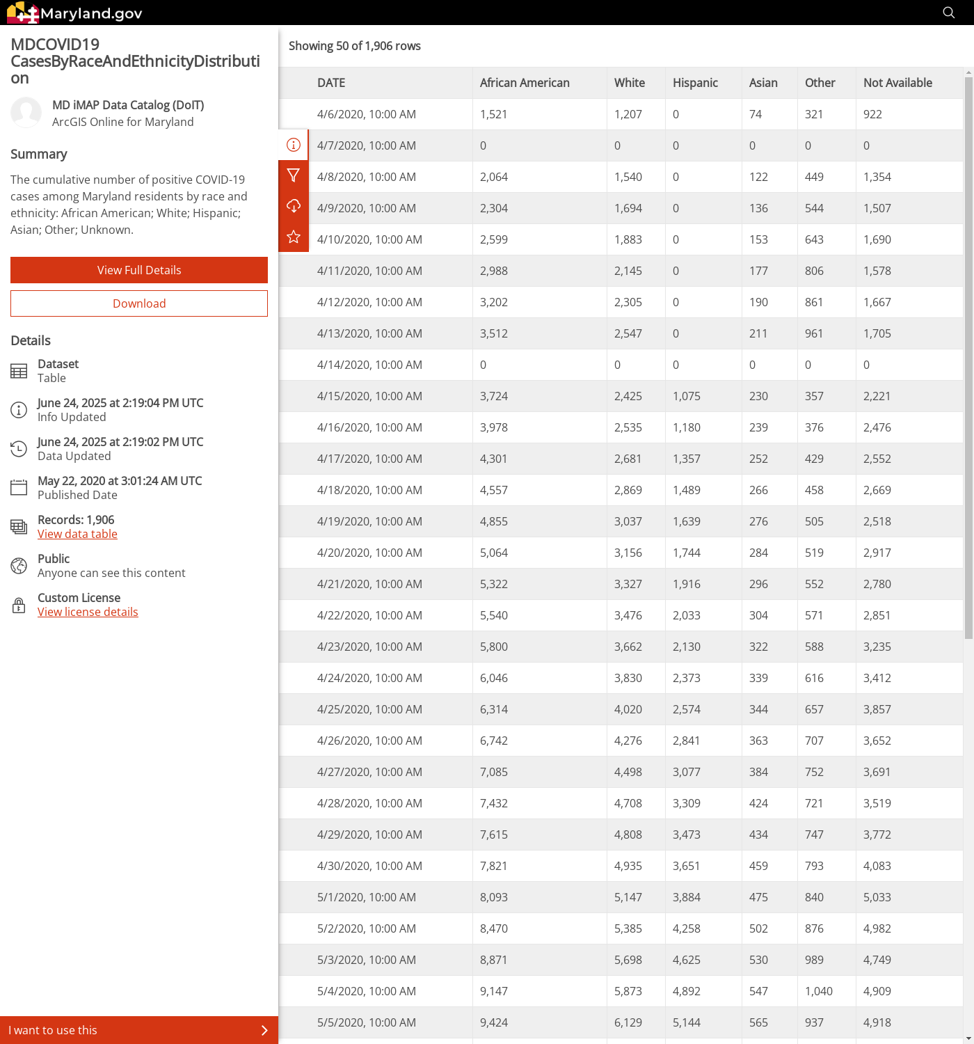 | Identifier | URL:https://data.imap.maryland.gov/datasets/maryland::mdcovid19-casesbyraceandethnicitydistribution/explore |