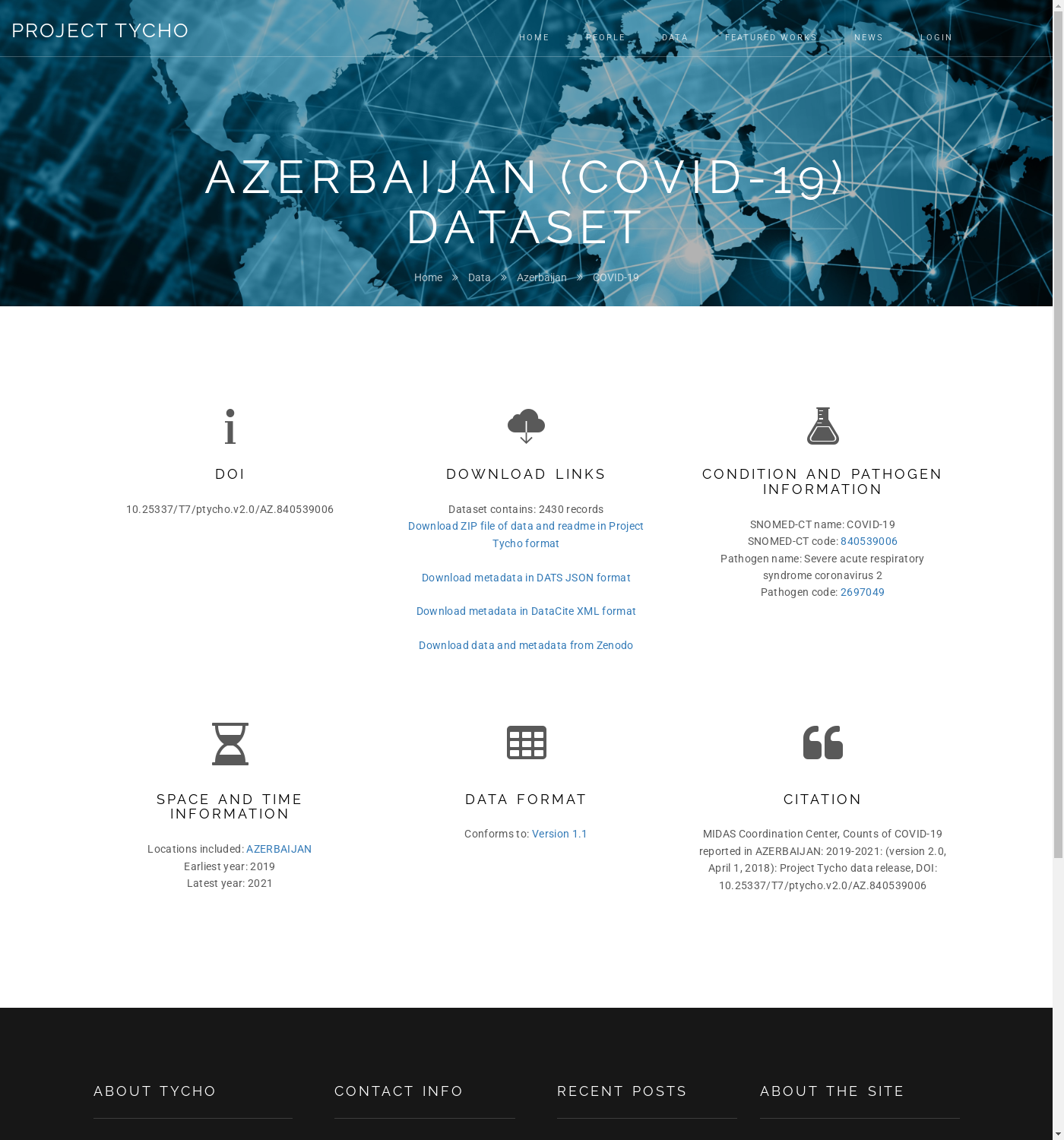 This Project Tycho dataset includes a CSV file with COVID-19 data reported in AZERBAIJAN: 2019-12-30 - 2021-07-31. It contains counts of cases and deaths. Data for this Project Tycho dataset comes from: "COVID-19 Data Repository by the Center for Systems Science and Engineering (CSSE) at Johns Hopkins University", "European Centre for Disease Prevention and Control Website", "World Health Organization COVID-19 Dashboard". The data have been pre-processed into the standard Project Tycho data format v1.1.