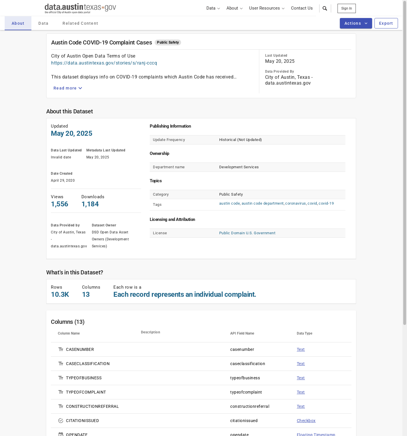 | Identifier | URL:https://data.austintexas.gov/Public-Safety/Austin-Code-COVID-19-Complaint-Cases/4p54-9544 |